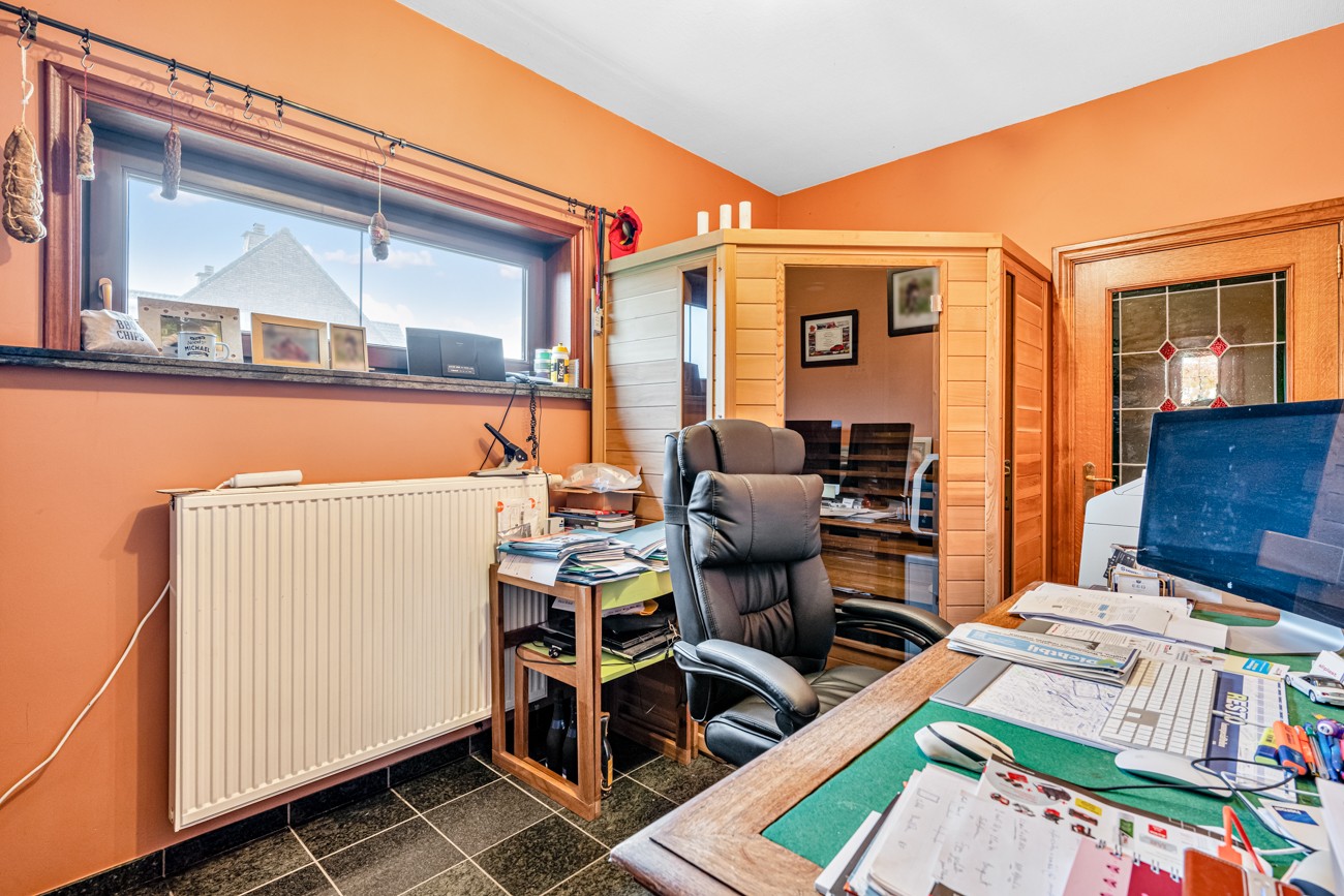 --VERKOCHT-- Deze landelijk gelegen villa met mooie loods op een grondopp van 1920m² heeft een prima aansluiting naar centrum Overmere en de autosnelweg. Bestaande uit: Inkomhal met monumentale trap, gastentoilet en vestiaire die netjes aansluit op de ruime bureau en de lichtrijke woonkamer: granieten vloeren, inbouw houthaard, zicht en toegang naar de binnentuin. Quasi nieuwe strak landelijke leefkeuken met marmeren werkblad voorzien van alle toestellen. Via de nachthal krijgen we toegang tot een badkamer met hoekbad, inloopdouche, wastafel en toilet. Wasplaats/berging voor wasmachine en droogkast. Ruime garage met automatische poort. Een natuurstenen trap leidt naar een mooi afgewerkte extra praktijkruimte aan de ene zijde en een zolder aan de andere zijde. De eerste verdieping omvat 2 gelijkwaardige slaapkamers waarvan 1 met een fitnessruimte en een master bedroom. Er is een uitvoerige verharding naar, naast en achter de werkplaats/magazijn. Een sectionale poort voor -en achteraan zorgen voor een makkelijke doorrit door/naar het magazijn. Verder is deze uitgerust met een keuken, toilet en douche. drijfkracht 380V, geïsoleerd dak (steeldeck), tussenverdiep voor stock, perslucht leidingen om de 5m, kortom uitermate geschikt voor elke vakman! Ideaal voor mensen met een (para) agrarische functie. Genieten van de perfect georiënteerde tuin met wijds uitzicht op landbouwgebied achter het magazijn. Extra's: VOLLEDIG ASBESTVRIJ, 20 zonnepanelen, elektriciteit conform, dubbele beglazing. BEL HUISMAKELAAR voor een bezoek op 0468/177.398 (BIV 511.907) Het vastgoedfilmpje: https://youtu.be/gQCI-1jDsLY schetst een mooi beeld van dit knap vastgoed.